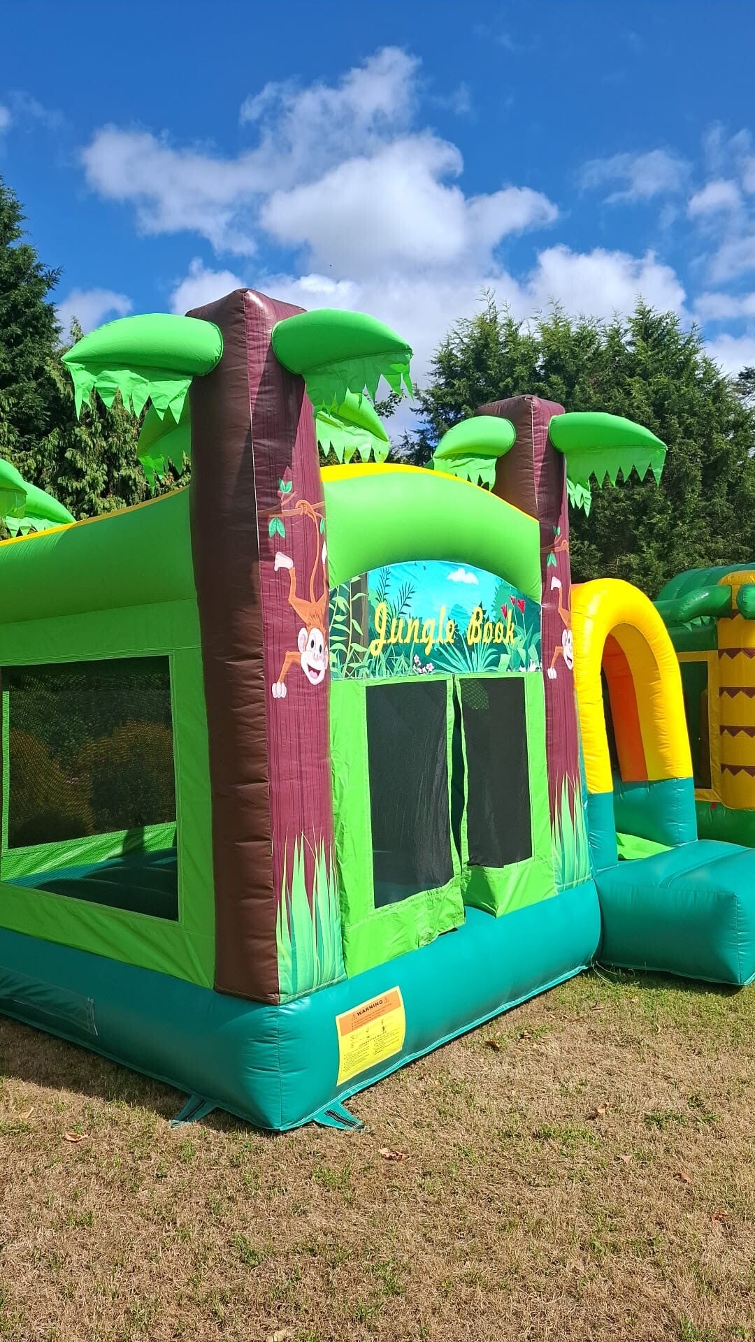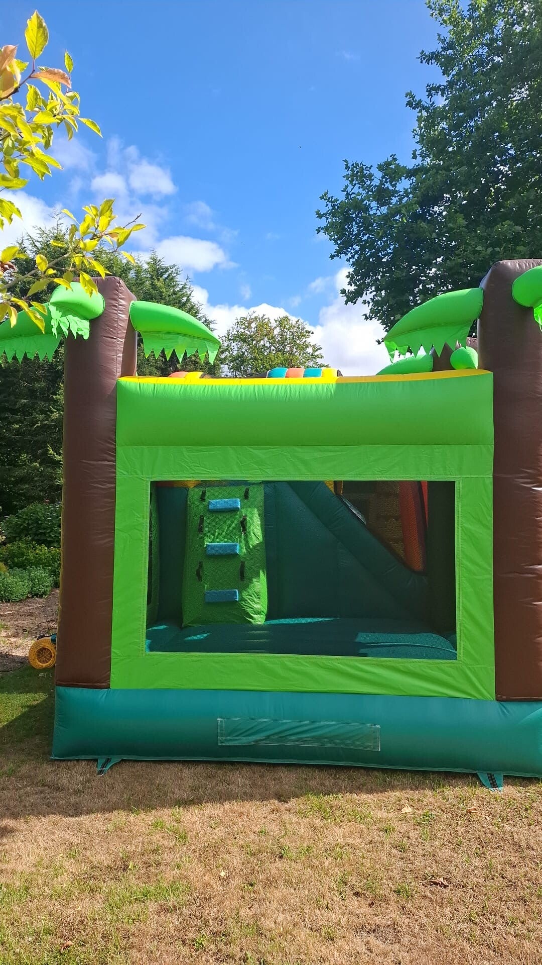 Dit kleurrijke, tropische springkasteel brengt de jungle tot leven met vrolijke dieren en groene palmbomen. Kinderen kunnen naar hartenlust springen, klimmen en glijden terwijl ze zich als echte ontdekkingsreizigers voelen in het regenwoud.